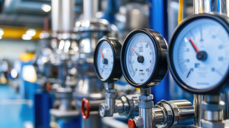 Detailed view of industrial pressure gauges used in a manufacturing plant, showcasing high-tech equipment essential for monitoring and controlling essential production processes.