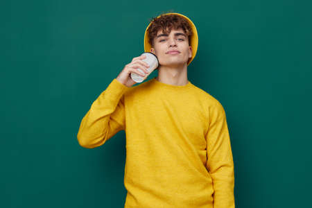 a joyful man stands on a green background in a yellow T-shirt and hat holding a cardboard coffee cup in his hand. Horizontal photo for inserting an advertising layout