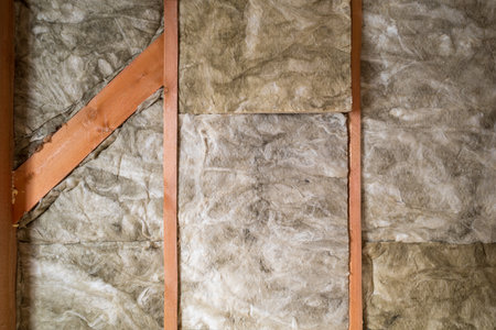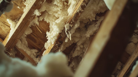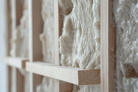 Close up of insulation material on wooden frame highlighting texture and construction details