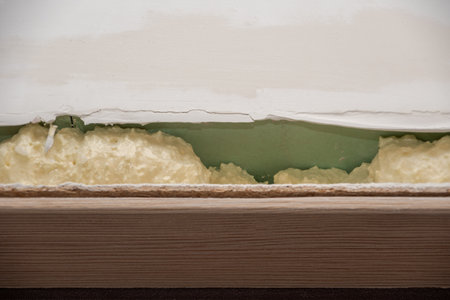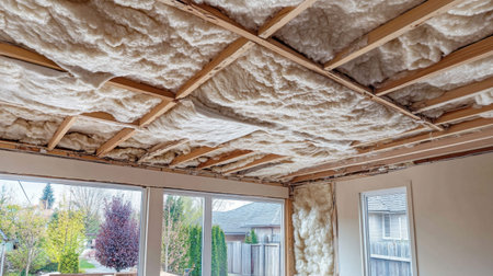 This image showcases an insulated ceiling featuring exposed wood beams and fiber material in a bright, airy room. Ideal for construction or renovation themes.