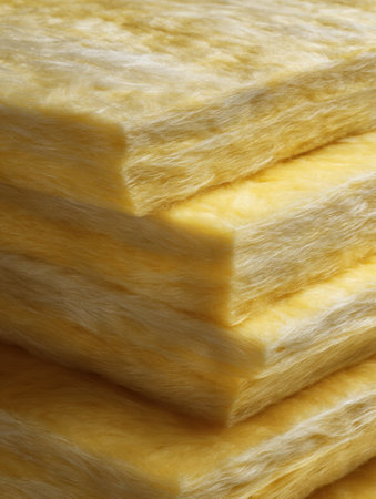 Layers of mineral wool wall insulation as background macro view. Yellow fiberglass texture. Building heat saving material. construction supplies