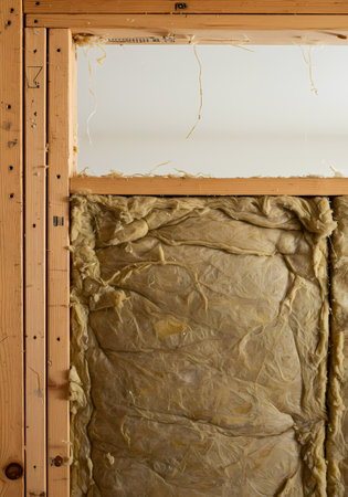 wall of a frame house is insulated from the inside with mineral wool. construction and renovation. copy space.