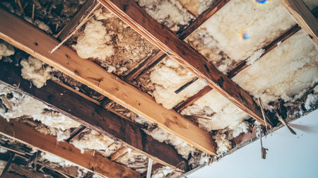 A close-up view of a deteriorating ceiling structure, revealing insulation and wooden framework. This image captures the essence of neglect and decay in an abandoned interior space.