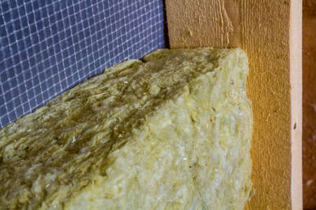 Mineral wool is used as a thermal insulation material in the construction of a house. Glass wool background.