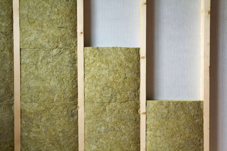 Rock wool insulation between wooden studs. Insulation of walls in a wooden frame house with rock wool. Residential frame construction