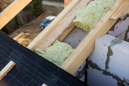 Thermal insulation mineral rock wool installation at the new building attic wall