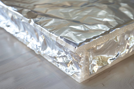 Aluminum foil sheet on tabletop surface, Foam board insulation with a reflective foil facing