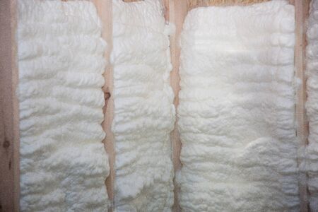 Insulation and wooden framing inside a wall. Construction materials and building techniques. copy space