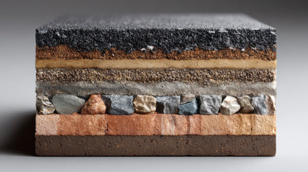 A close look reveals multiple layers of different materials, including gravel, sand, and clay. Each layer displays distinct colors and textures, showing geological diversity.