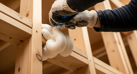 Applying expanding foam insulation to a light wooden frame. Gloved hands hold the foam applicator, filling gaps in the structure.