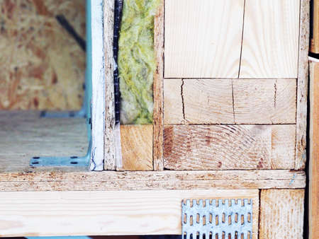 Close-up of wooden frame for future walls insulated with rock wool and fiberglass insulation staff for cold barrier. Comfortable warm home, economy, construction and renovation concept.