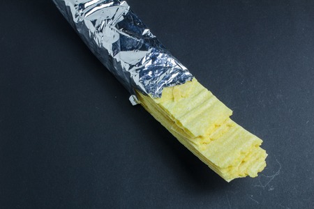 Opened pack of delicious spicy potato chips over black table. Open bag.