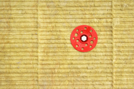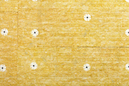 Fragment of wall insulation of the building with heat-insulating mineral wool fixed with plastic clips. The concept of reducing heat loss in modern buildings, copy space, close-up.