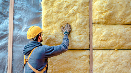 A construction worker installs yellow rock wool batts into a house wall, increasing energy efficiency and sound insulation during the building process.
