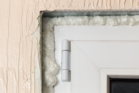 Installation of doors using polyurethane foam. Cylindrical foam. Yellow foam insulation. Mounting foam between wall and door