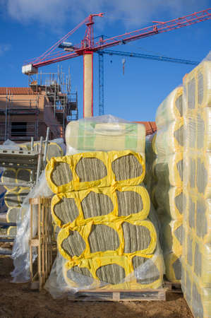 Packaging of thermal insulation material, stone wool wrapped in foil is waiting to be installed on the walls of the residential building under construction with scaffold.