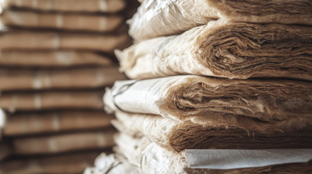 Rolls of new insulation material arranged in a bright, warm environment