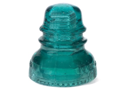 Close up of a transparent turquoise high voltage insulator or isolator in sunlight on electric tower on blue sky background. Electric power transmission line
