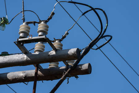 Close-up view of old electricity post with wires on insulators in sunny day on clear cloudless sky