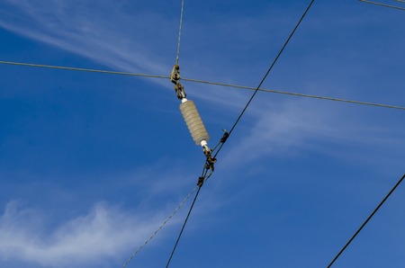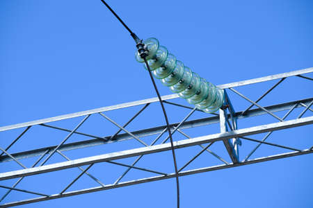 High-voltage electrical insulator of the electric line on a background of blue sky. Portal of the high voltage line. n