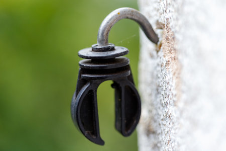 A close-up shot of a black plastic insulator with a curved metal hook attached to a textured, light-colored surface, with a blurred green background.