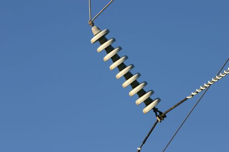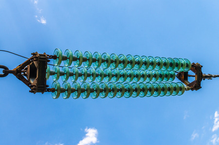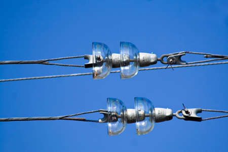 Close-up of insulators on high voltage pylons against the background of blue sky. Made in a sunny day, deep blue skies