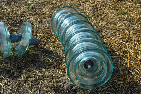 Glass transparent high-voltage insulator is in storage. Industrial background.