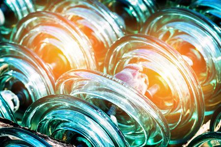 Close-up of sparkling glass disc insulators on a high-voltage power line against a clear blue sky, symbolizing energy infrastructure