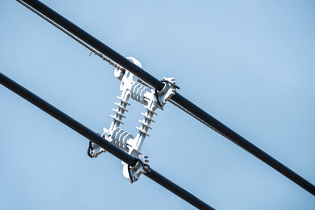 Close-up view of high voltage power lines featuring ceramic insulators, showcasing intricate details against a clear blue sky, highlighting energy transmission technology.
