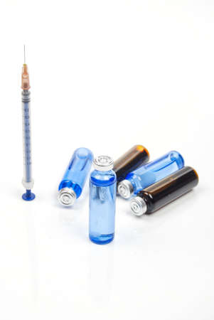 Glass medicine bottles with injection fluid with blue aluminum caps and syringe for vaccination. Cancer, painand diabetestreatment, pharmaceutical medicine concept