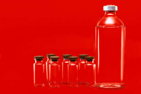 glass bottles with medicines for dangerous viral disease vaccine on a red background on a medical theme with a copy space.