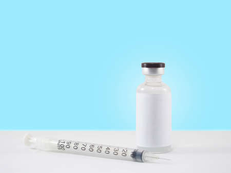 Blank label medical glass vial and plastic syringe for injection on white table with blue gradient background. Concept of vaccination, diabetes and cosmetic injection. Copy space.