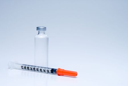 bottle of insulin for diabetes and injection syringe, healthcare concept with pile of syringes on background