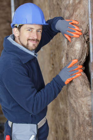 Male worker in uniform wearing helmet and holding glass wool for insulating attic under his arms.