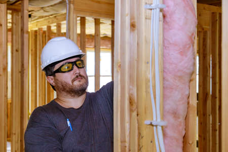 Work composed of mineral wool insulation in the wall heating insulation warm house, insulation, a builder at work