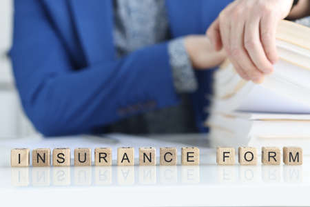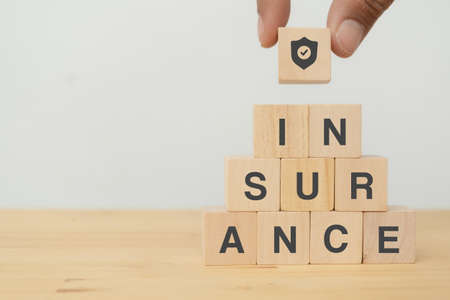 Wooden Blocks with Words House Insurance. Business Insurances business Concept to get coverage for Life, Home, Car, Travel, Medical and Dental, Personal Accident