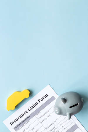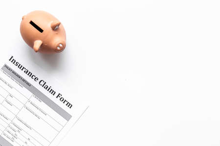 Commercial insurance claim form. Office desk with official contract and agreement of property. Desktop with money and clipboard. Top view
