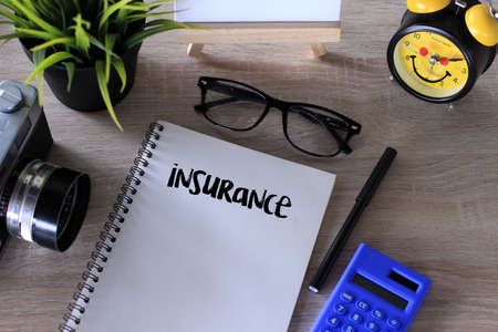 Business and finance concept. Top view of calculator,magnifying glass and pen on white background written with INSURANCE.