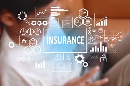 Business concept. Insurance development words over asian young man playing digital tablet background. Text typography design