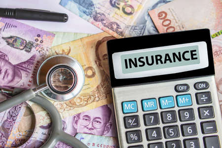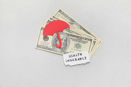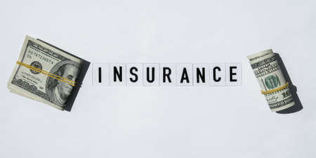 Text INSURANCE around US dollar banknotes. Health, life, home, car Insurance. Insurance business concept. Business budget of wealth and prosperity finance. Health care or medicare insurance and vaccination costs. Financial crisis. Covid-19 crimes