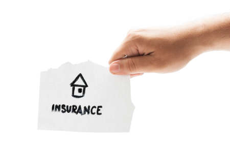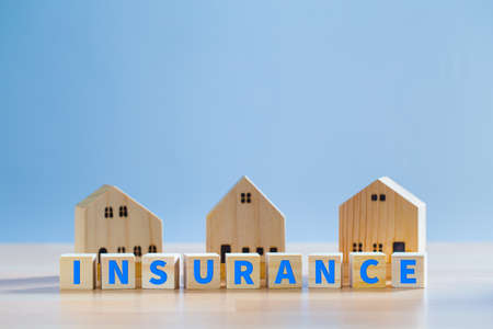 Text INSURANCE on wooden block and house model, Property home insurance protection, family house, concept.