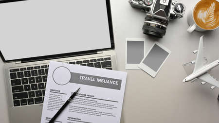 Travel concept, top view of workspace with travel insurance, laptop, camera, travel items and coffee cup, clipping path