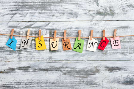 Word INSURANCE formed by wood alphabet blocks. On old wooden table.