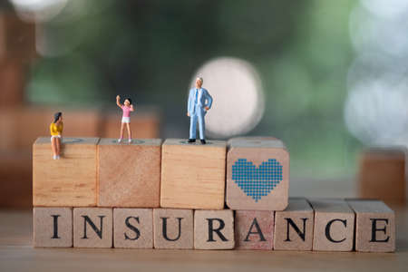 Miniature family on wood brock with word is insurance. The concept of insurance of family life and property. Family care concept.