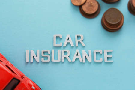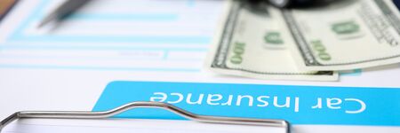 Close-up of important documents about car insurance. Blue toy machine and pencil lying on currency banknotes and paper folder on table. Assurance concept