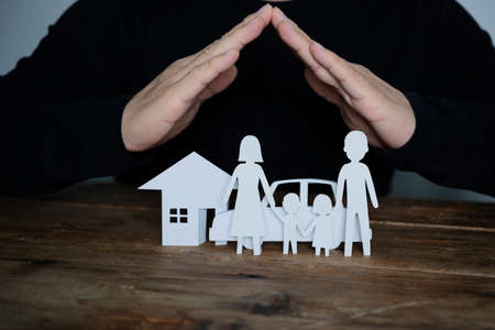 Concept of insurance with hands over a house, a car and a family. Group of paper cut