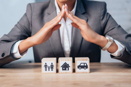 cropped view of lawyer holding hands above wooden cubes with family, car and house