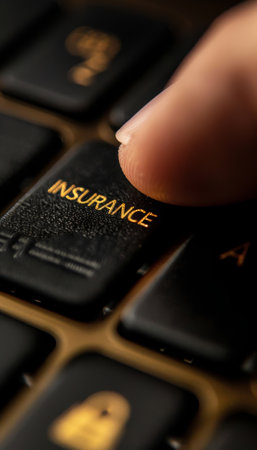 Close-up of elegant black and gold keyboard with fingers typing the word insurance
