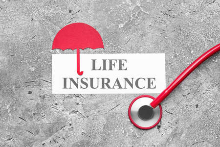 Text LIFE INSURANCE with umbrella and stethoscope on grunge background