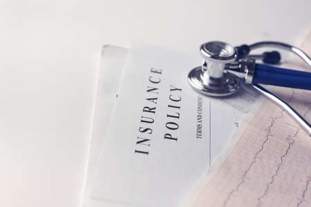 health insurance. Health insurance form, medical stethoscope, cardiogram chart. for health planning concept with copy space on white